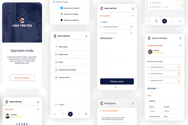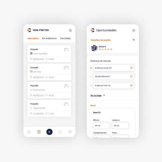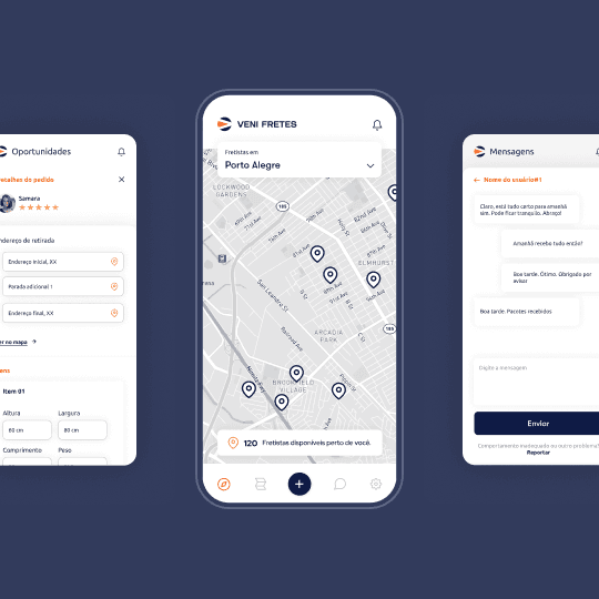 A Veni, uma plataforma de fretes sob demanda, similar ao modelo do Uber, precisava de uma interface que fosse intuitiva e de fácil navegação, oferecendo uma experiência ágil tanto para os motoristas quanto para os clientes. O desafio era criar uma solução que facilitasse o agendamento e o acompanhamento de fretes, garantindo que o processo fosse simples, eficiente e sem complicações.